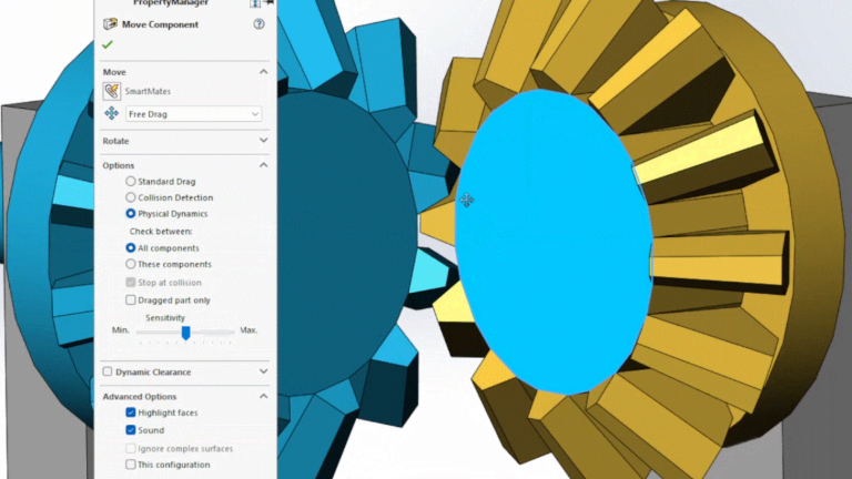 To use Physical Dynamics, activate the option and select the components to be considered, and then click-drag one of the components through its range of motion. In the image above, a gear mate would impose perfect 1:1 motion, and the teeth might never touch, so Physical Dynamics is used to better understand the true mechanism action and backlash encountered.